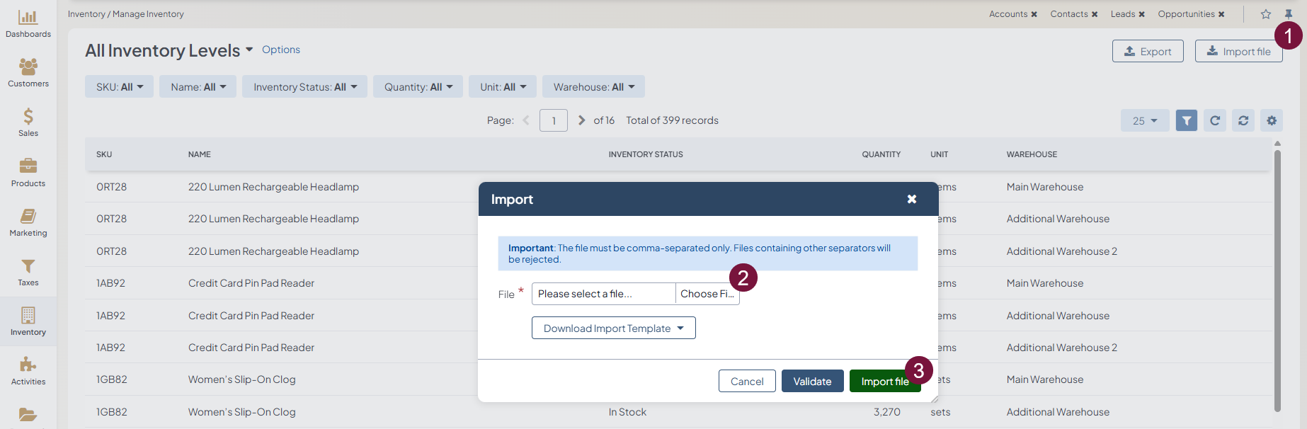 Import File option helps import the product inventory statuses (In Stock, Out of Stock, or Discontinued) and levels (quantity and unit) for the warehouses using the .csv file that follows the inventory details data structure.