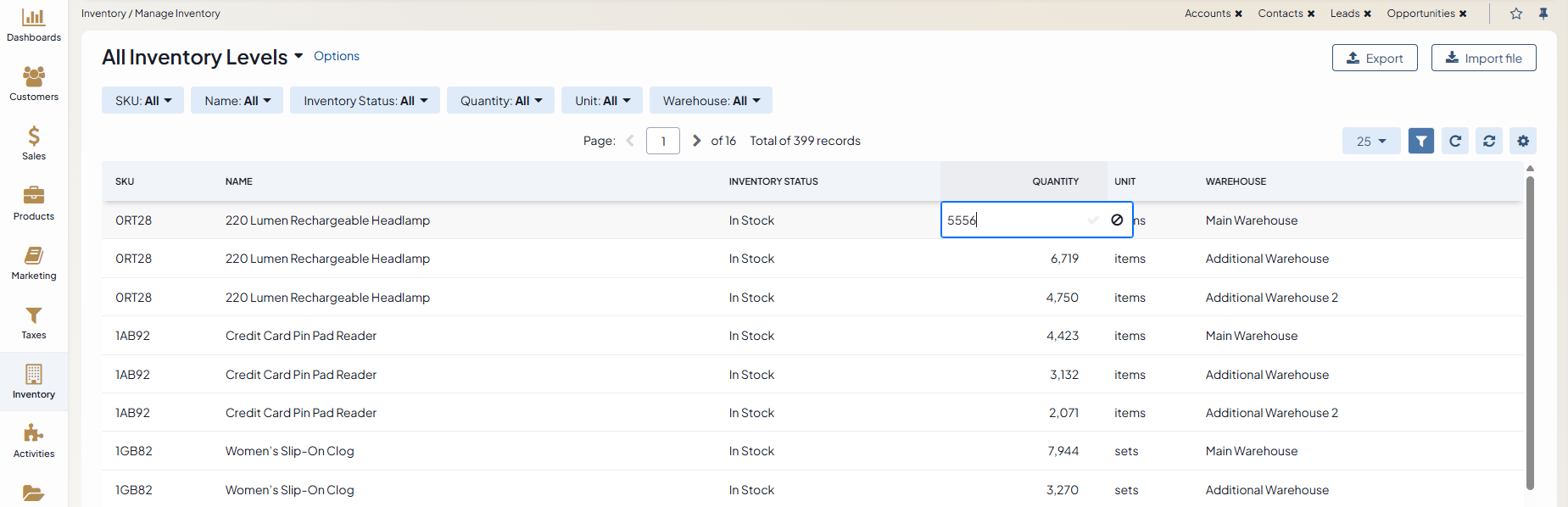 Edit inventory status and quantity in the respective columns directly by clicking on the current value.