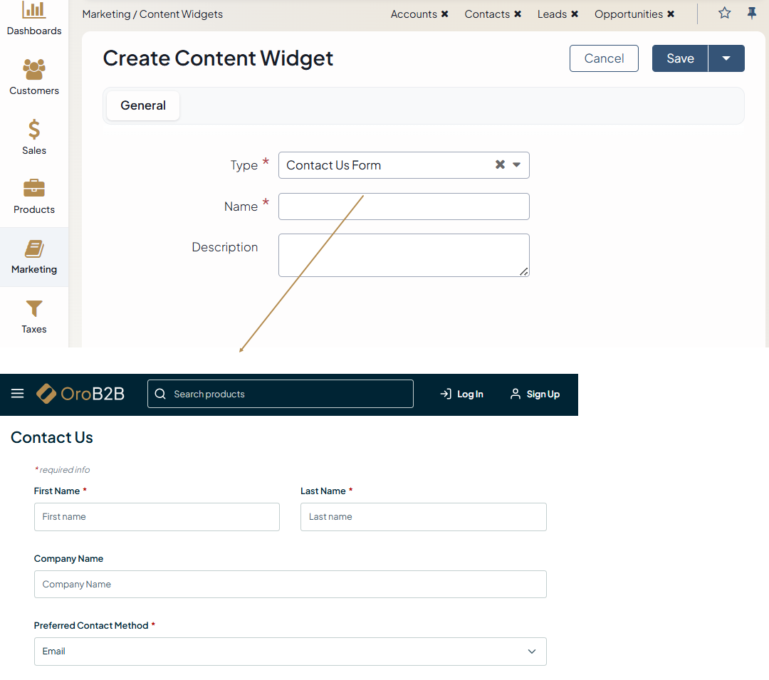 Contact Us Form - Enables you to add a standard Contact Us form to the Contact Us storefront page. Once the widget is saved, add it to the Contact Us Form field under the theme configuration.