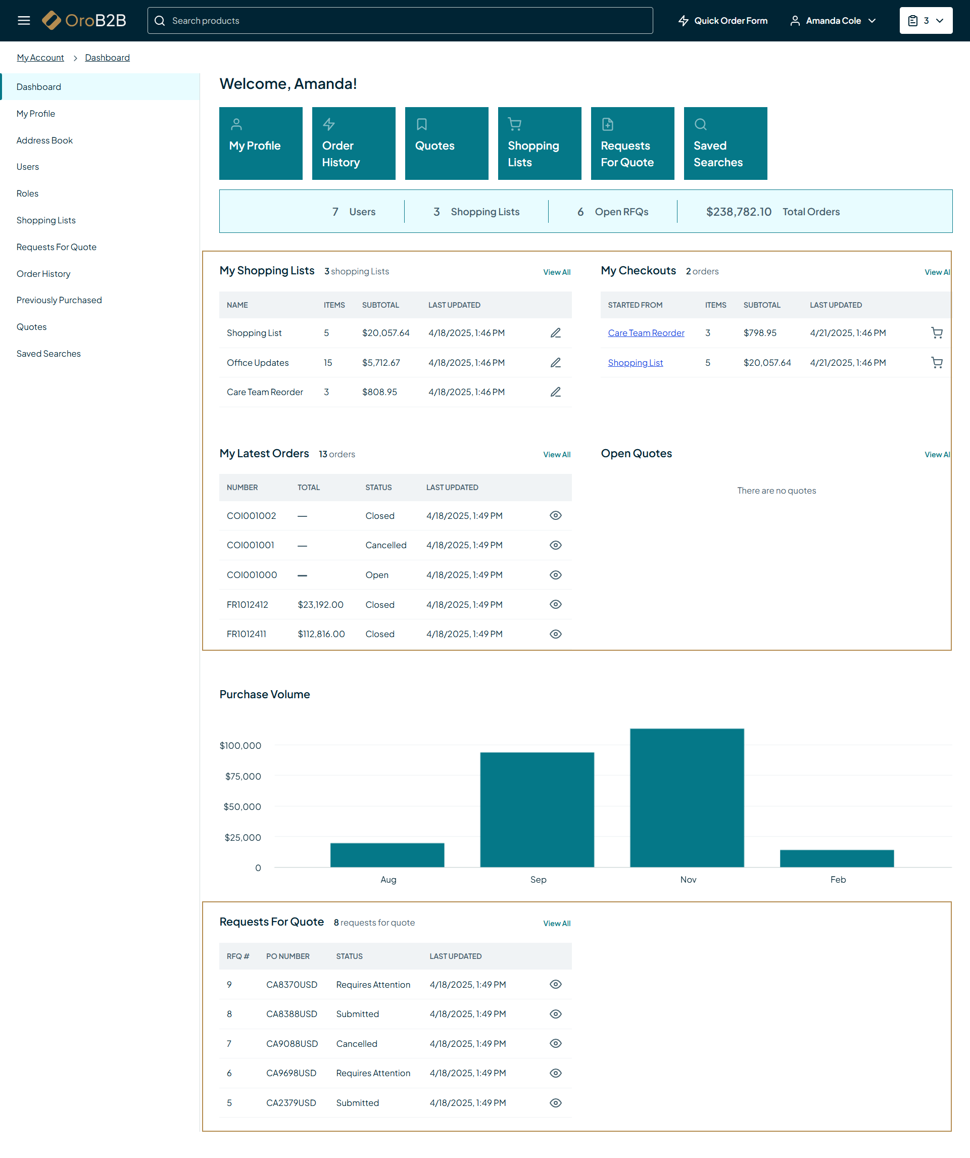 Requests for Quote – Lists the most recent RFQs submitted by the current customer, including RFQ number, PO number, status, and last update. Depending on the customer user’s permissions, they may or may not see RFQs from other users within their organization.