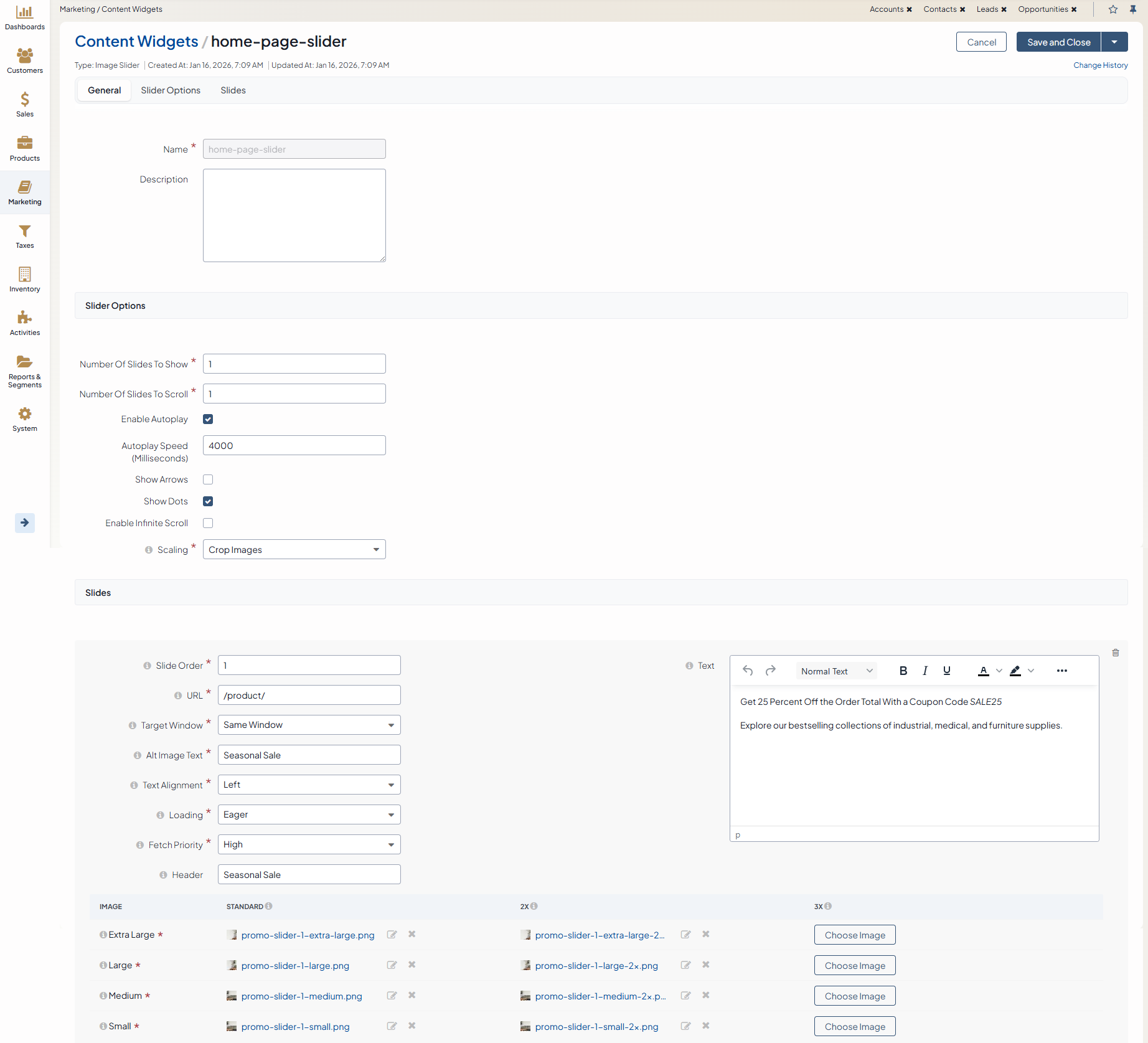 For existing sliders created before Loading and Fetch Priority options were introduced in OroCommerce v.6.1.7, image loading behavior is preserved and images continue to load eagerly by default.