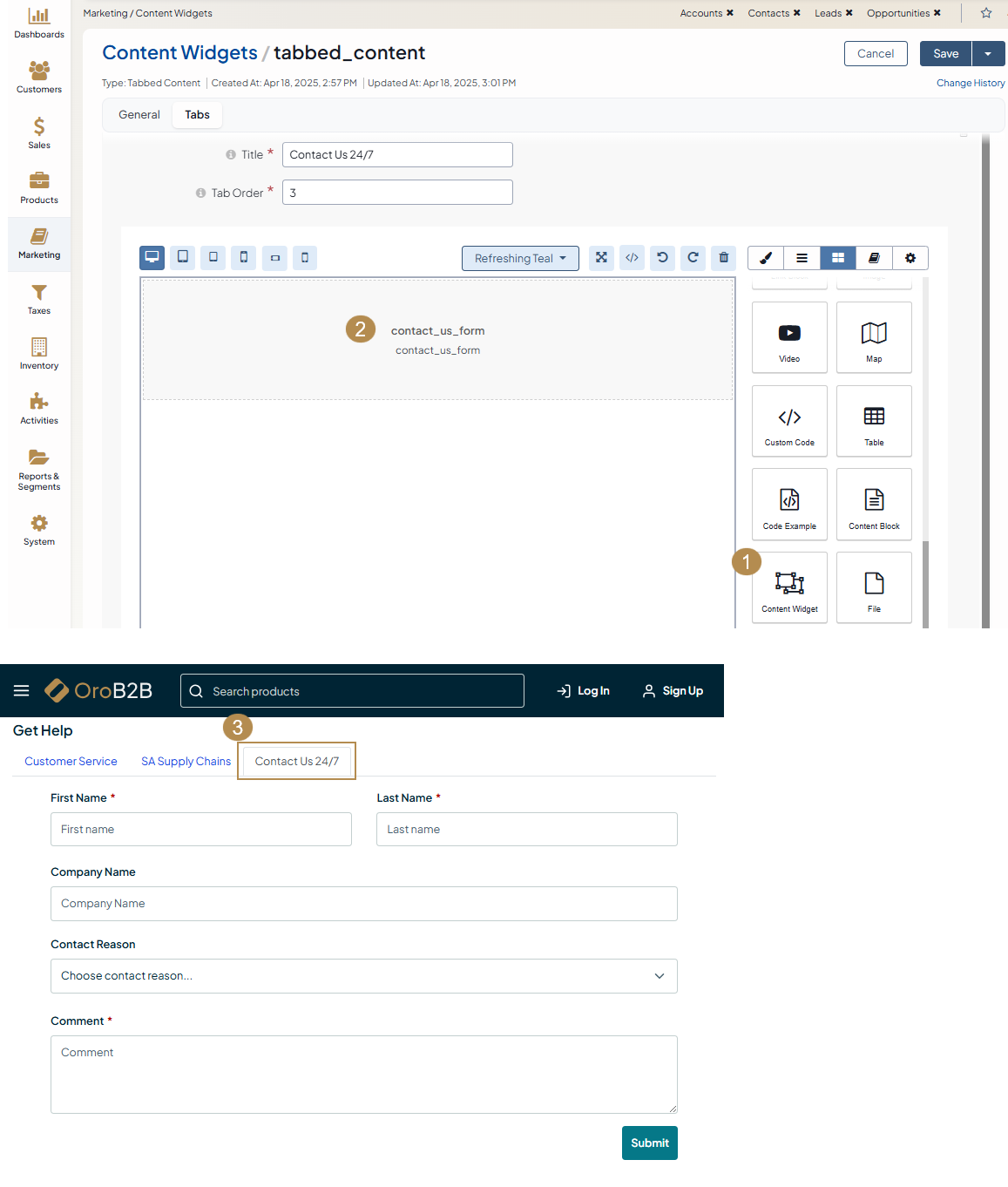 Tabbed content widget uses the WYSIWYG editor which enables you to inject other content widget(s), such as a contact us form, into your current tabbed content widget.