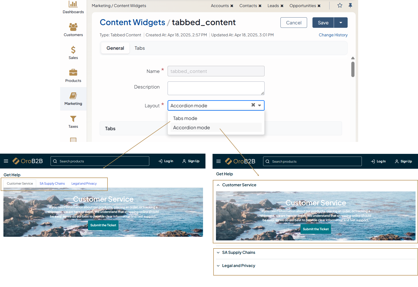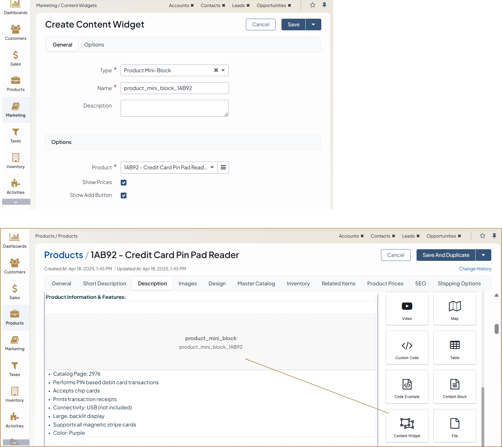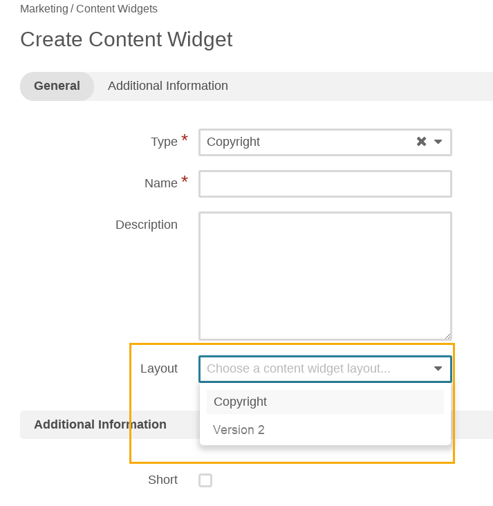 Content widgets are snippets of structured information that you can insert into any WYSIWYG field in your application. WYSIWYG fields are available throughout OroCommerce; for example, in category descriptions, on edit pages of products, content blocks, and landing pages.