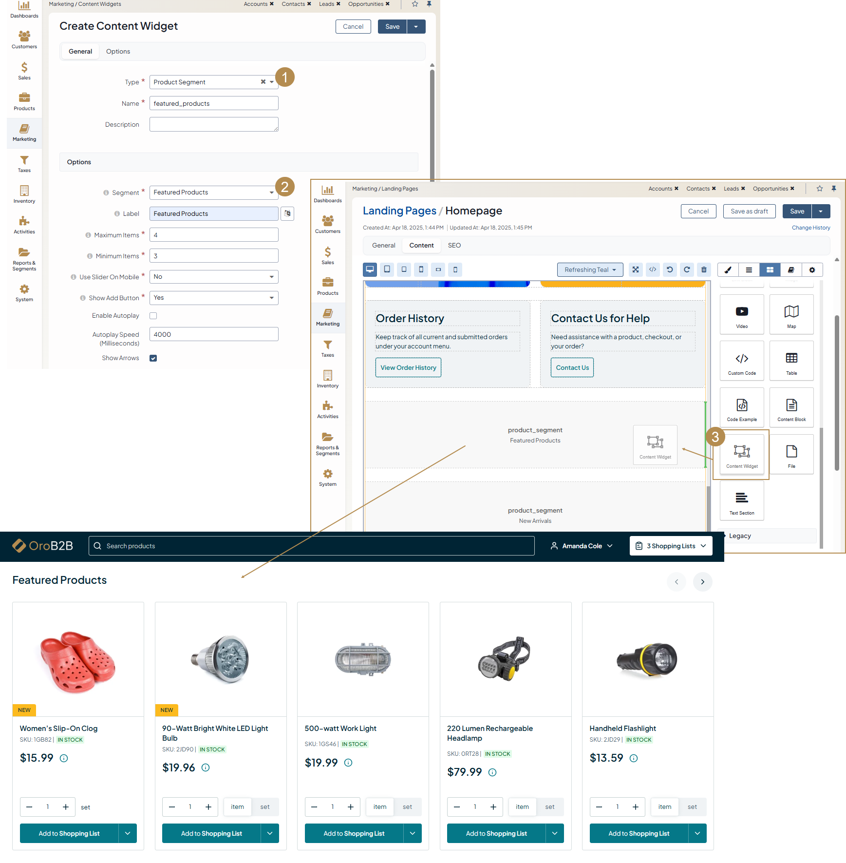 Product Segment - Enables you to add a product segment content widget to your website page. Only segments with type Product are listed in the Segment field dropdown. You can modify an existing segment or create a new one under Reports & Segments > Manage Segments. You can add a label to be displayed above the list of the products, configure the max and min number of items to show, whether to use slider on mobile, and show the Add to Shopping List button in the storefront. Additionally, you can enable or disable autoplay and control its speed in milliseconds, select whether to display dots and/or arrows at the bottom of the product segment and on touchscreens, enable or disable infinite scroll, and enable the display of inventory levels for customers in the storefront.