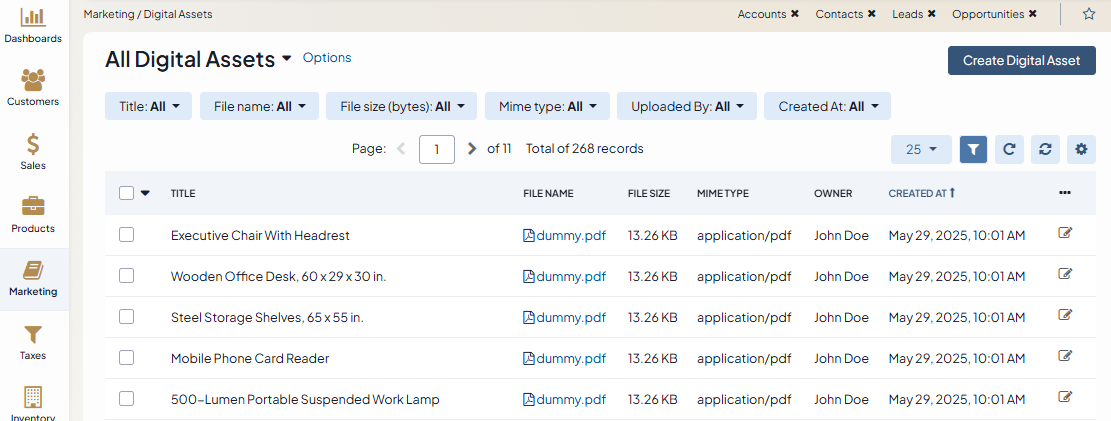 Digital asset management (DAM) is a tool for organizing, storing, and managing digital files in one central location. For this purpose, use the Digital Assets section that lists all assets uploaded to the DA database of your application. Here, you can quickly find and edit the assets you need and create your personal database of the shared files.