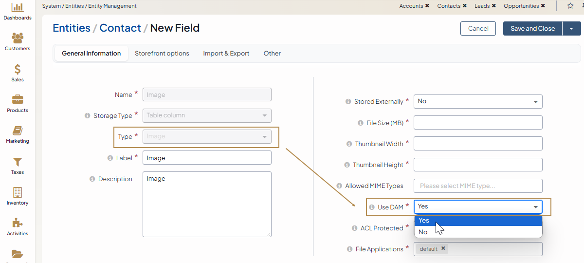You can enable the DAM functionality for any entity attachment field that is of a file, image, multiple files, or multiple images type when creating an entity field. For more details, read the Create Entity Fields topic.