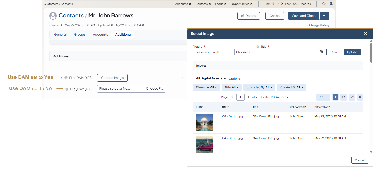 If DAM is enabled, it changes the usual uploading behavior of the related type field for the selected entity. Now, your entity attachments are first uploaded to the DA database. Then, you can select the required asset from the list of available DA records. Any other DAM-supported entity can further re-use all attachments that are saved to the DA pool.