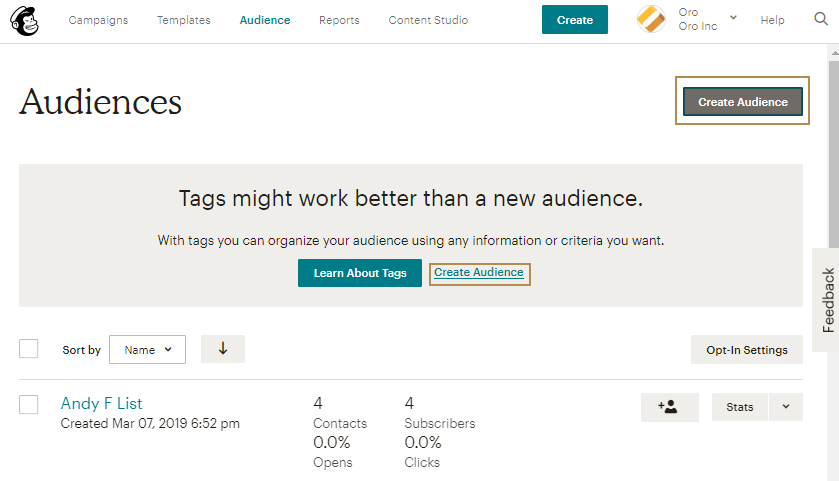 To create a campaign in the Oro application, create a Marketing List first. This list will create a segment on the Mailchimp side: