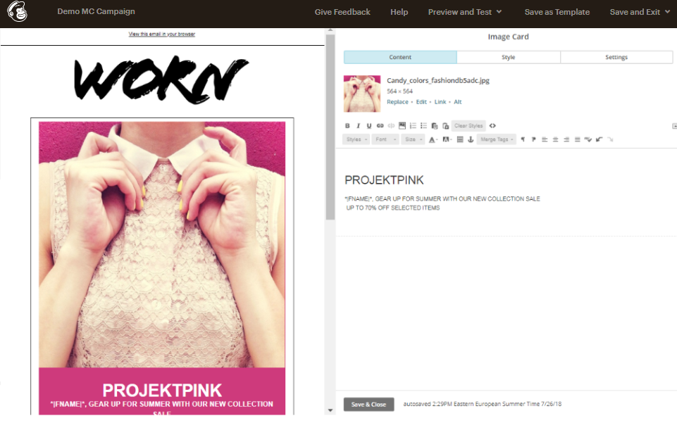 To ensure that your address each of your contacts by name, select Merge Tags and First Name in the options within Content text window. This way, if you type in Hi *|FNAME|*, your subscribers will see their first name instead of their email address in the campaign they receive from you.