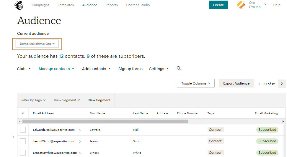 At this point, if you go back to Mailchimp, you will be able to see data from the Oro application (subscribers’ first and last names and contact details) synced into your Mailchimp list. Please keep in mind that other information that you may have specified when creating a list on the Oro side, such as dates of birth or custom details, are not synced.