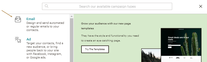 4. Content — Click Design Email to add content for your email. You will be redirected to a new page to select a pre-set campaign template or create your own.