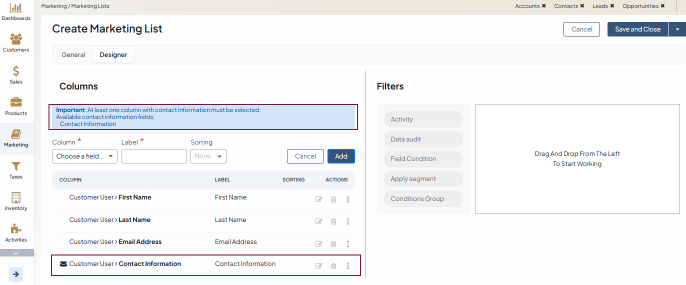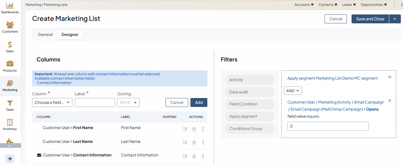 For instance, if you need to exclude customers who did not open your email from a certain campaign, go to Marketing > Marketing List> Create New Marketing List. Fill in the mandatory fields, remembering to include at least one contact column below.