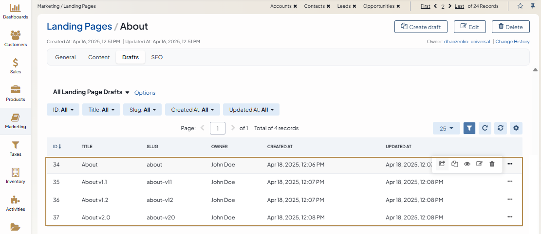 Manage Landing Page Drafts
