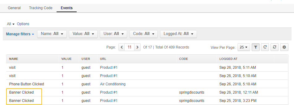 Similarly, clicking a specific campaign banner will trigger a Banner Clicked event. Its value is the number of times the banner was clicked.