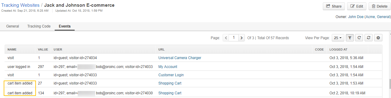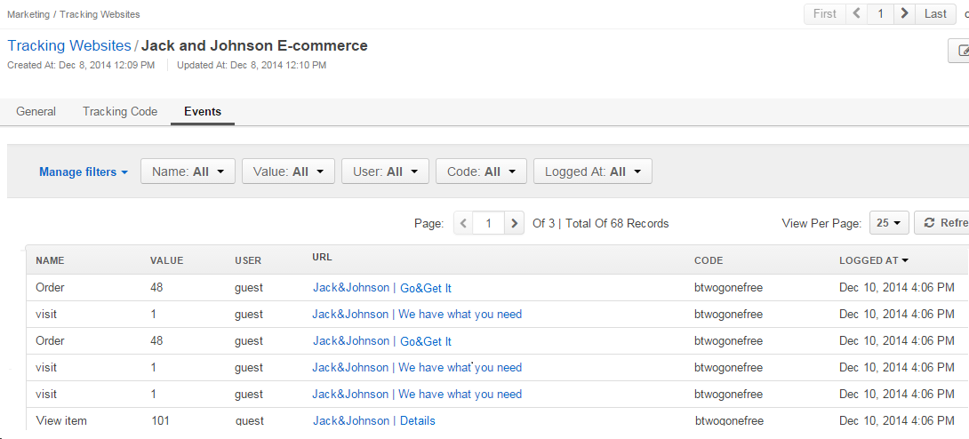 In the example above, you can see the three kinds of events defined for the Jack and Johnson E-commerce website tracking. As soon as a user gets on any of the website pages, a visit event is logged with the 1 value. As soon as a user gets to the Orders page of the website, an Order event is logged, with the value that stores an ordered item id. As soon as a user gets to the Item Details page of the website, a View item event is logged with a value that stores a viewed item id.