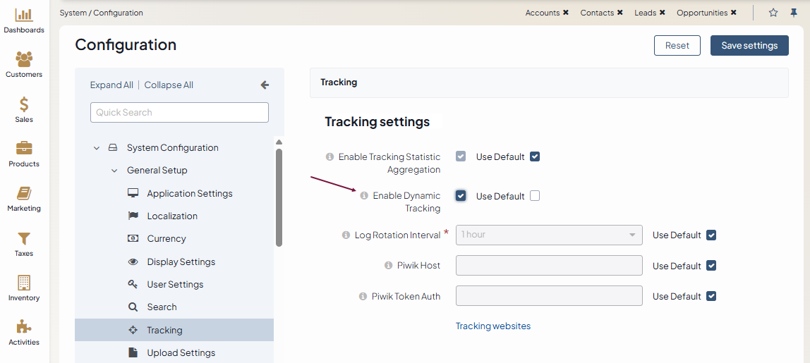 Before you start using tracking websites, ensure that you have configured and enabled marketing features and tracking settings in Oro application via the system configuration.