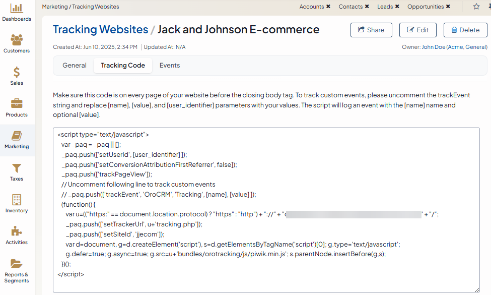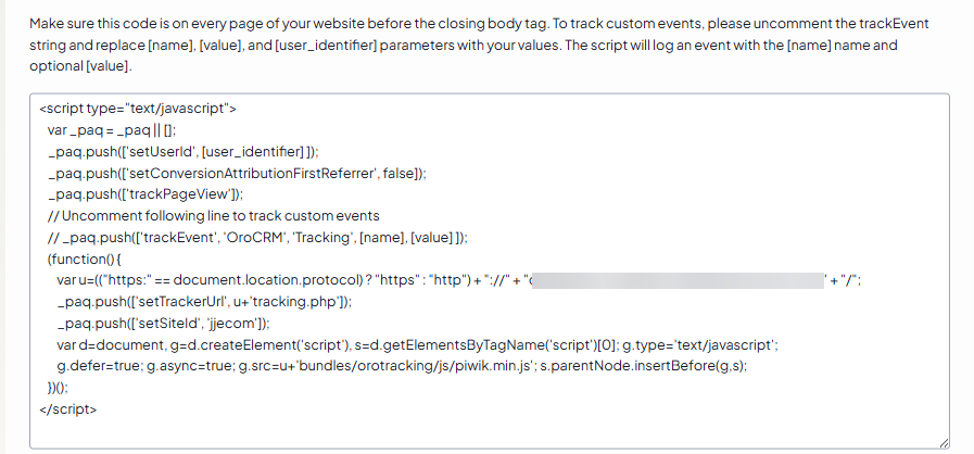 Once the tracking configuration is ready, create a tracking website record and add the generated code to the web pages that you want to monitor.