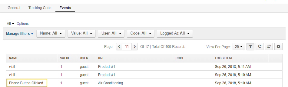A list of events on the tracking website page helps you monitor every occurrence of the tracked action (e.g. a user has accessed a pre-defined part of the website following the campaign). You can find event name and value, user id (guest or user email), the URL of the visited page, the code of the marketing campaign and time when the event was logged.