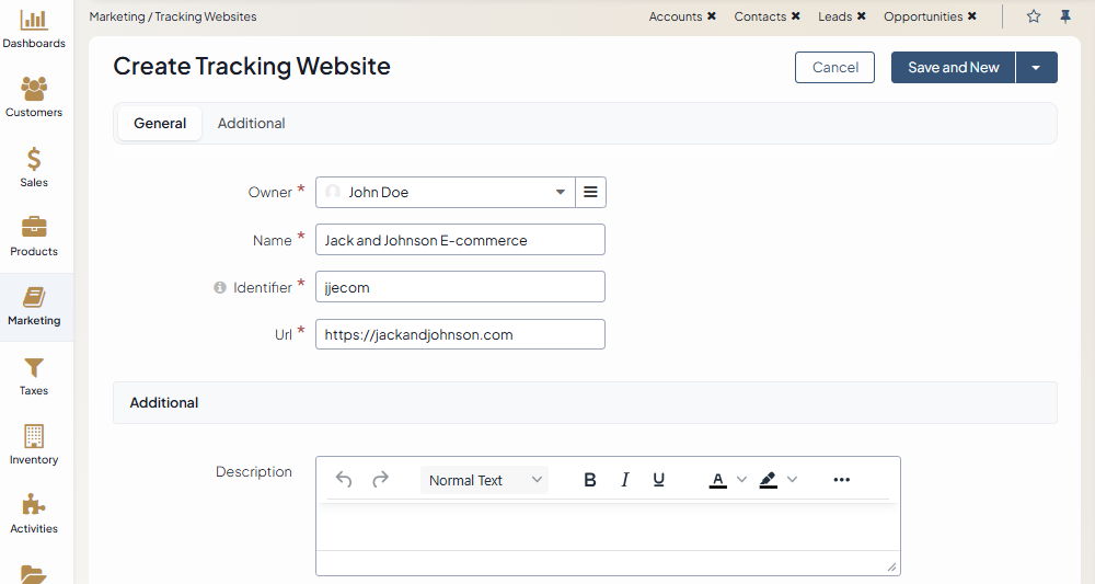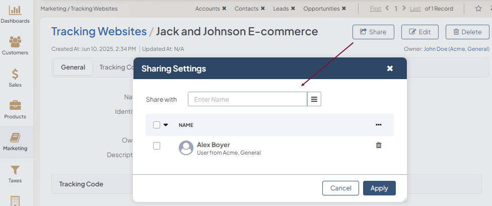 Owner — Limits the list of users who can manage the tracking website record to the users, whose roles allow managing tracking websites of the owner (e.g. the owner, members of the same business unit, system administrator, etc.). By default, the field is prepopulated with the user creating the tracking website.