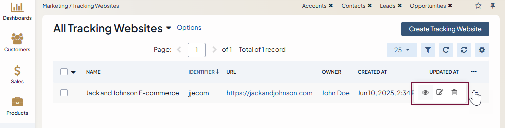 The same actions are available on the page of all tracking websites under Marketing > Tracking Websites.
