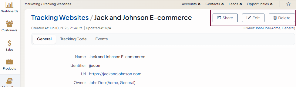 You can manage tracking websites directly from their details page. Here, you can perform the following actions: