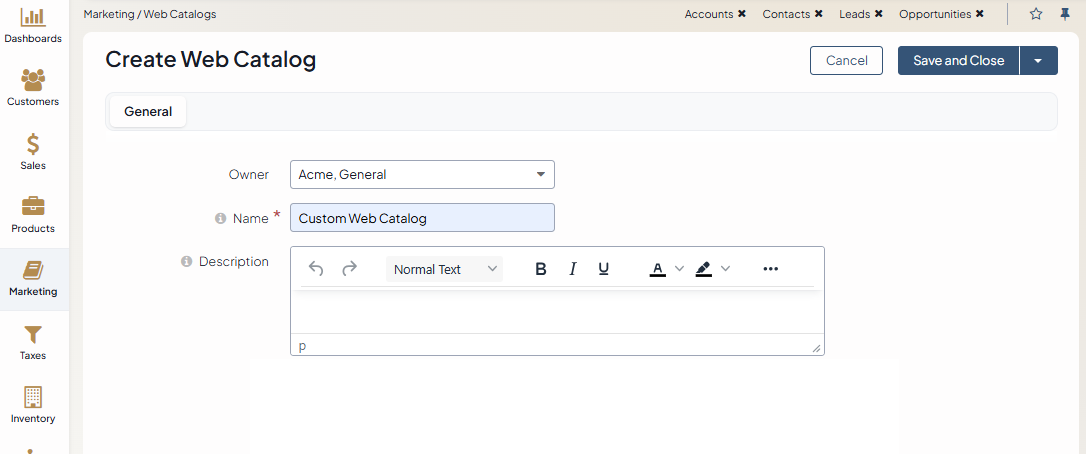 Navigate to Marketing > Web Catalogs in the main menu.