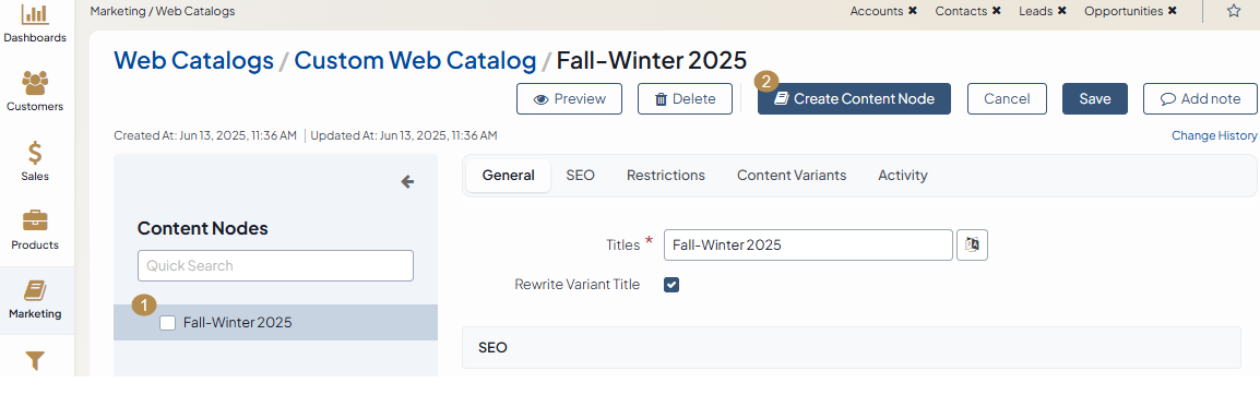 Under the homepage node, create main menu content nodes (e.g., the first level of the main menu in the storefront) as described in the Set Up the Homepage, First Level Menu, and Sub Menus section. We recommend creating a dedicated landing page for the main menu nodes of your web catalog.