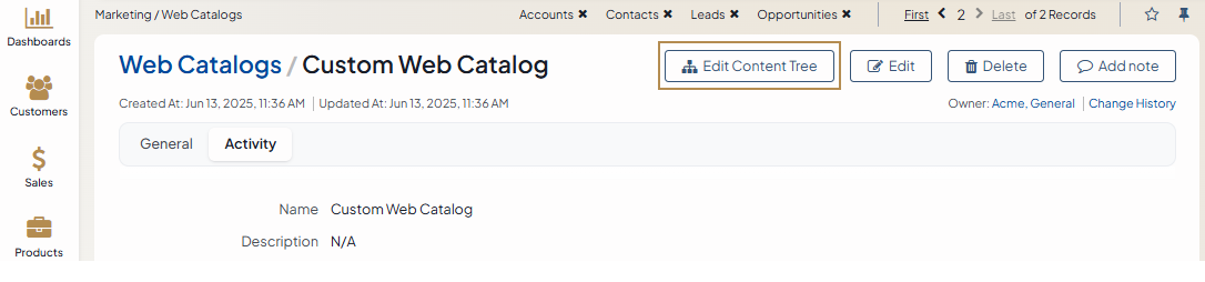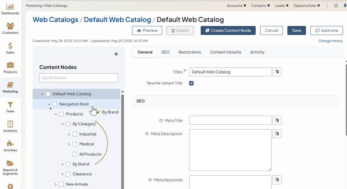 Once you created a web catalog, update your web-catalog configuration to enable it for the necessary level (either globally or per website), and, if necessary, tune the individual catalog nodes visibility to hide/show the node or particular content variant for specific localization, on a particular website, or for certain customer.