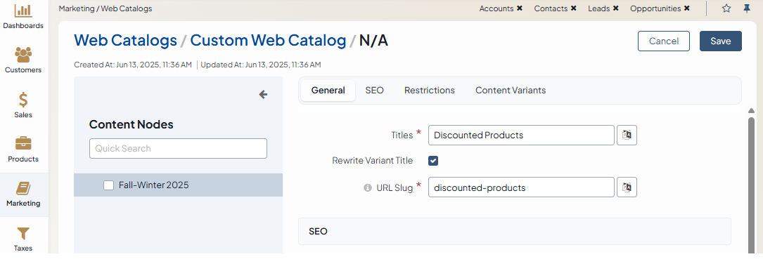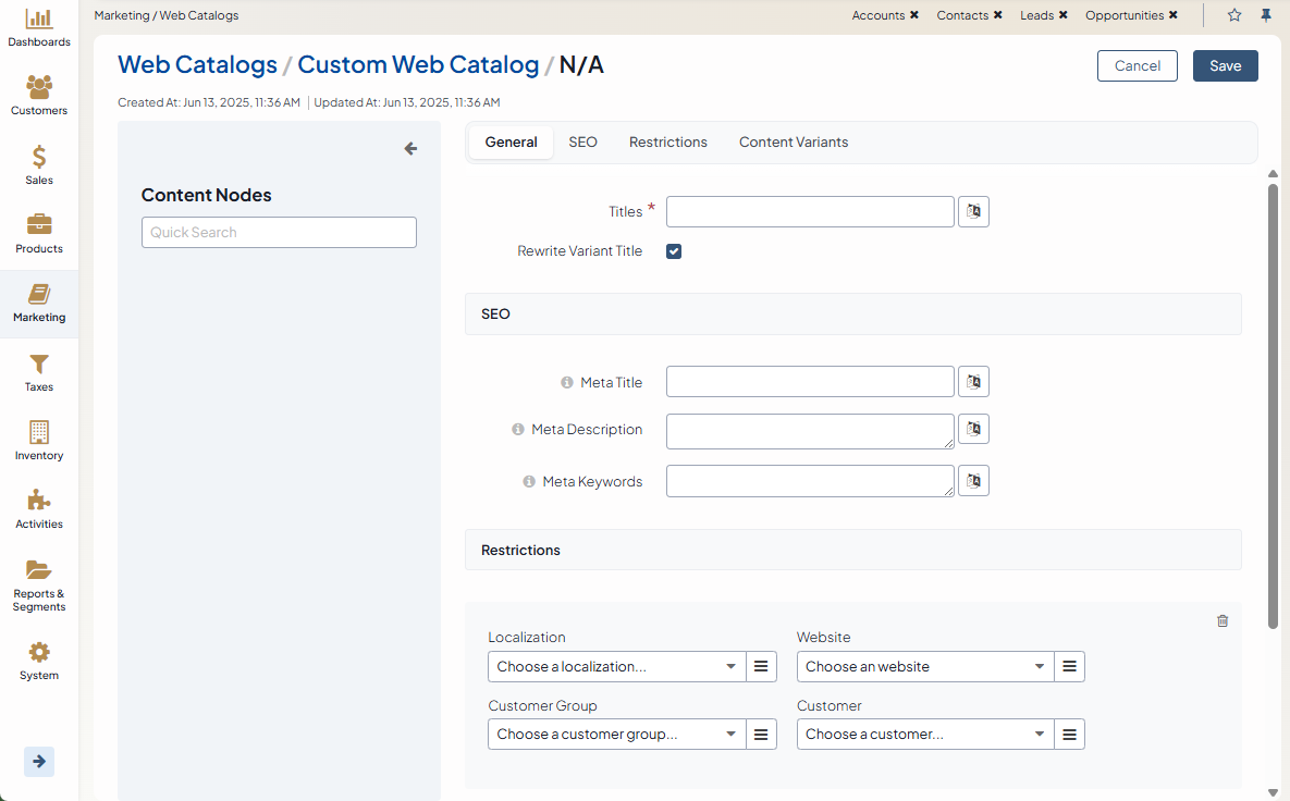 On the page that opens, fill in the details of the homepage node of the web catalog as described in the Set Up the Homepage, First Level Menu, and Sub Menus section.