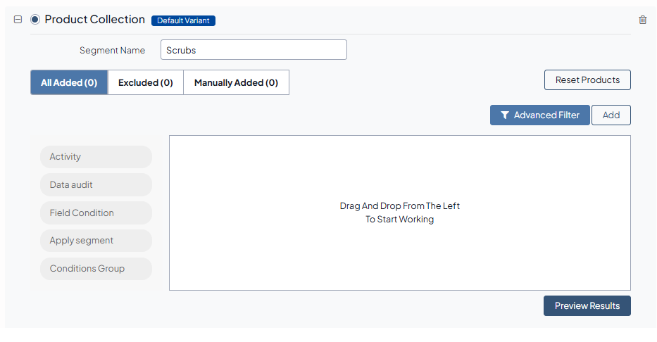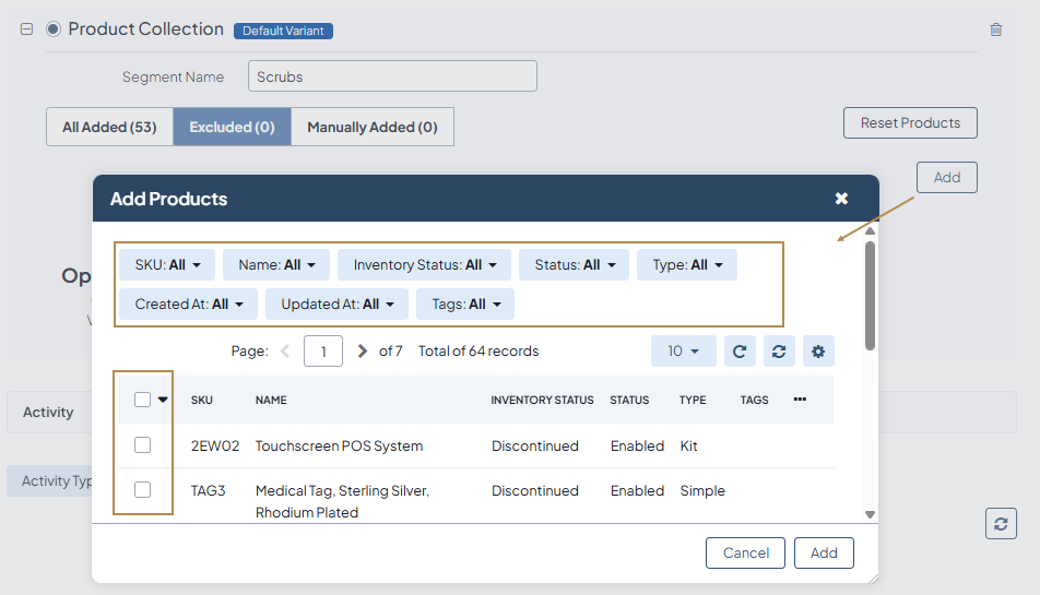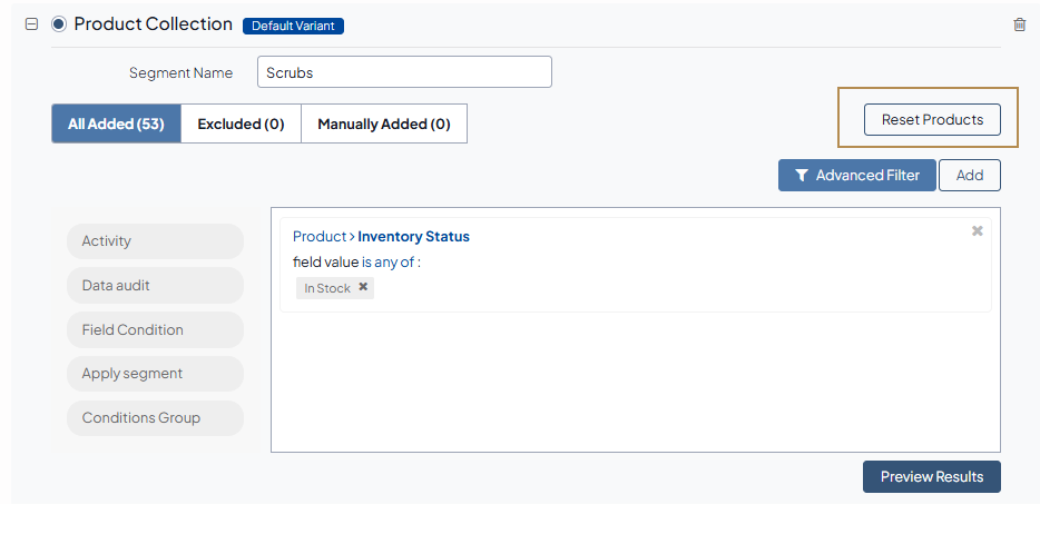To clear all filters and reset the product collection to the default state, click Reset Products next to the tabs.