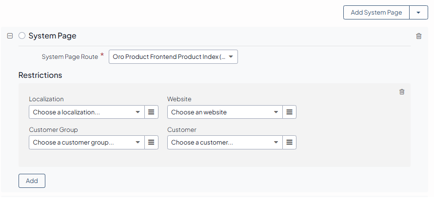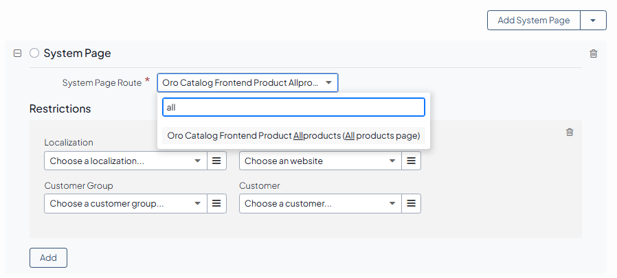 From a System Page Route list, select the Oro Catalog Frontend Product Allproducts (All Products page).