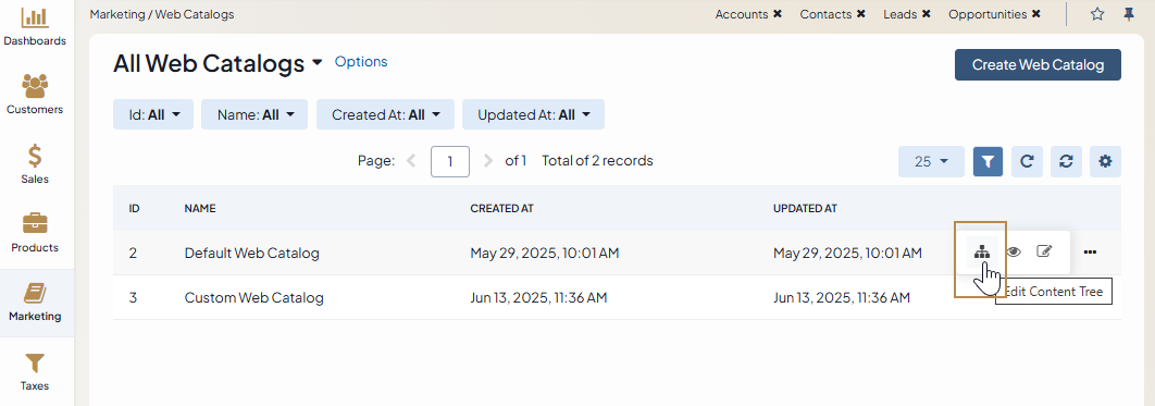 For the necessary web catalog, hover over the more actions menu to the right and click to start editing the catalog content tree.