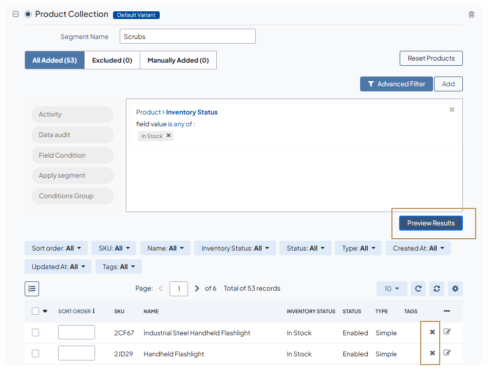 Click Preview Results to check whether the products found via the filter match your criteria or to exclude unnecessary items from the list.