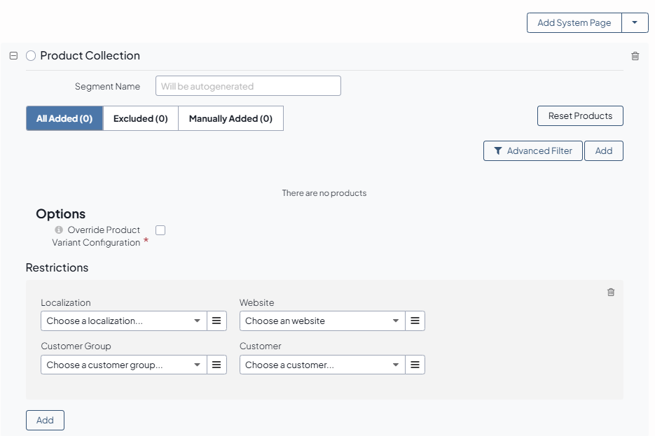 When your collection is not selected as a default variant for the content node, you can define the condition when the product collection overrides the default content variant in the Restrictions section beneath the product collection preview. See Configure Content Visibility section for more information.