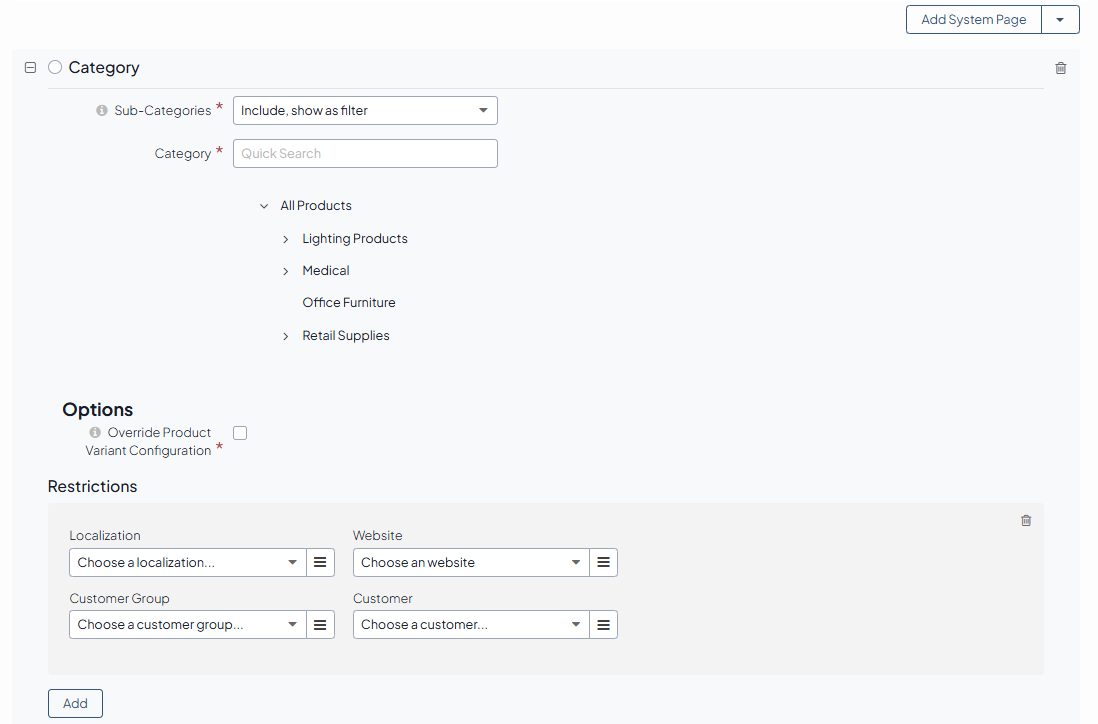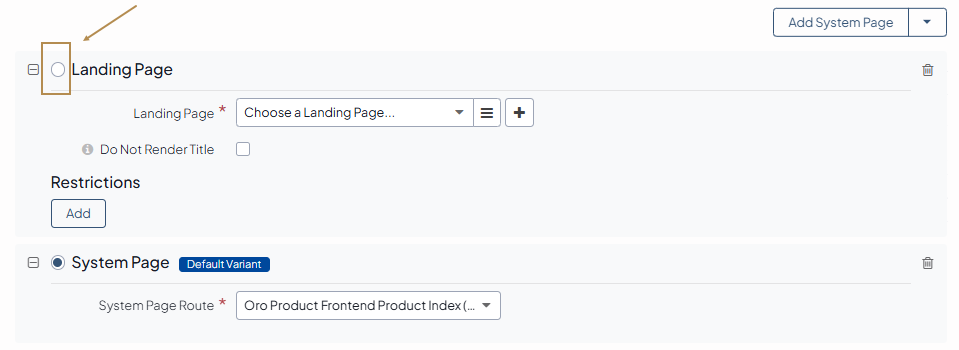 When your system page is not selected as a default variant for the content node, you can define the condition when the system page overrides the default content variant. See the Configure Content Visibility section for more information.