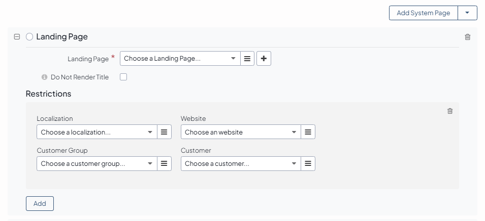 When your landing page is not selected as a default variant for the content node, you can define the condition when the landing page overrides the default content variant in the Restrictions section beneath the selected landing page. See Configure Content Visibility section for more information.