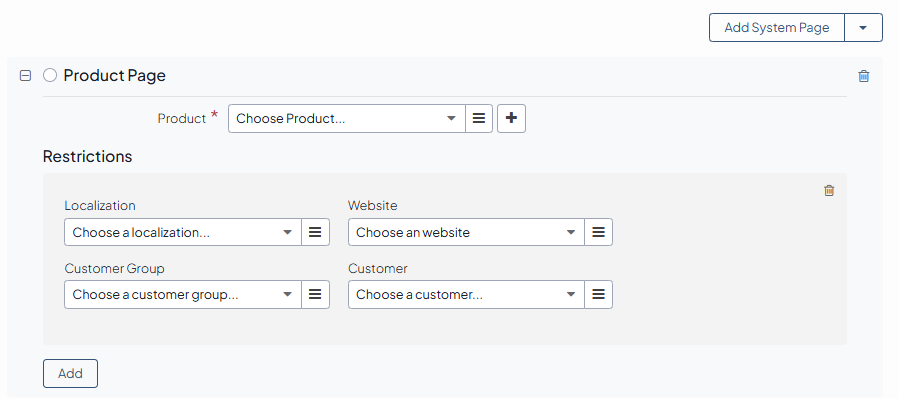 When your product page is not selected as a default variant for the content node, you can define the condition when the product details override the default content variant in the Restrictions section beneath the selected product. See Configure Content Visibility section for more information.