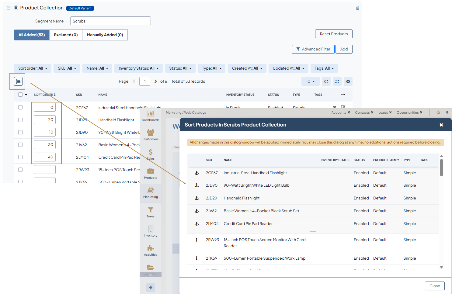 Each product selected in the All Added grid can have a sort order associated with it that will define the default order in which the product will appear in the storefront. 0 is the highest priority, and you can input any positive decimal number. Empty values will be sorted last. You can also click on the Manage Sort Order button to be able to manage the sort order of products in the product collection in a separate pop-up window. Products with grey background have sorting number assigned. Product with white background have no sorting order. You can drag and drop the horizontal background separator up and down to apply or clear the sorting order. All changes made to the sorting order in this dialog window will be applied immediately.