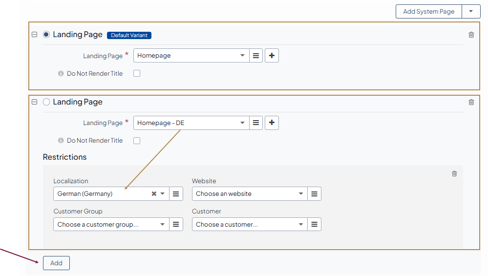 To apply content to more than one localization, website, and customer group or customer, click Add and set up additional conditions where content should override the default option.