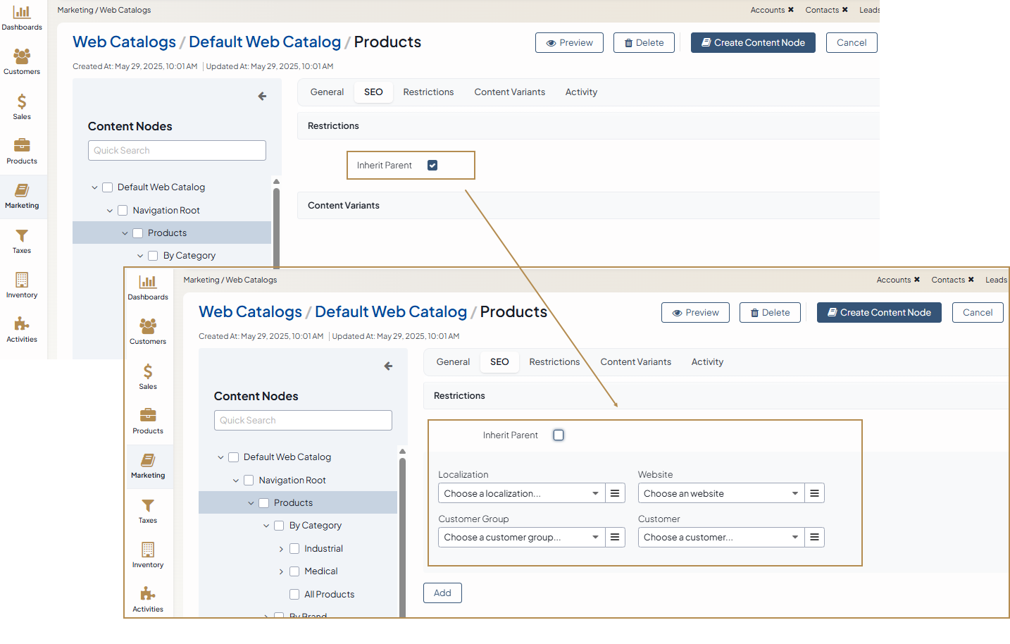 To modify the inherited default settings, clear the Inherit Parent box, and specify the restrictions by selecting all or some of the following: target localization, website, and customer or customer group.