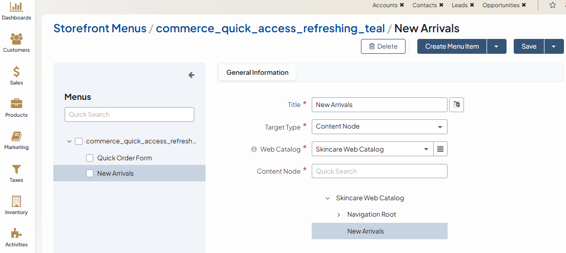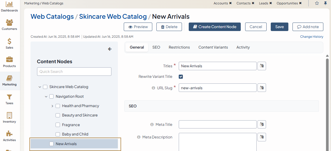 Click Create Content Node outside of the Navigation Root range and provide it with a name (e.g., New Arrivals). The URL slug is automatically generated, but you can modify it if necessary.