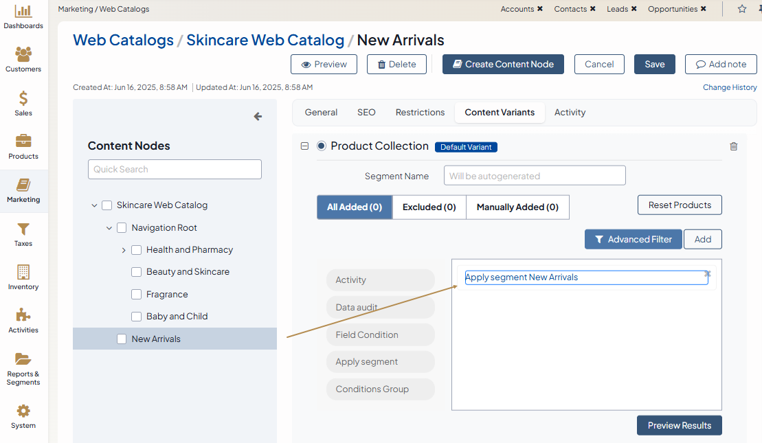 In the Content Variants section, add Product Collection as a content variant for the node you are creating, and populate it with the items for sale. In the example below, we have applied an existing segment (New Arrivals) to the product collection we are adding as a content variant.