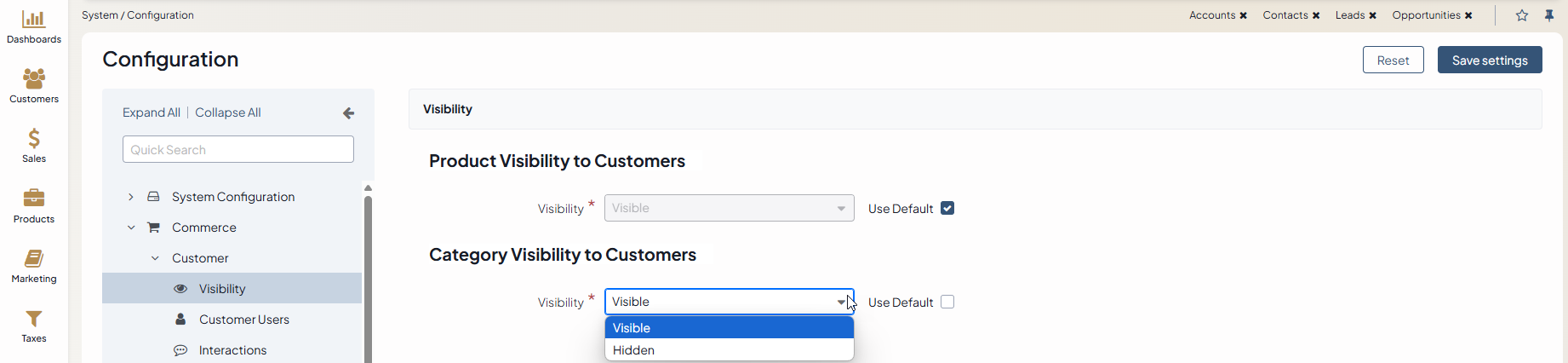 You can define system-wide category visibility for existing customers. This setting applies only whenever a category visibility configuration is set to Config. These settings apply globally and can be toggled under System > Configuration > Commerce > Customer > Visibility.