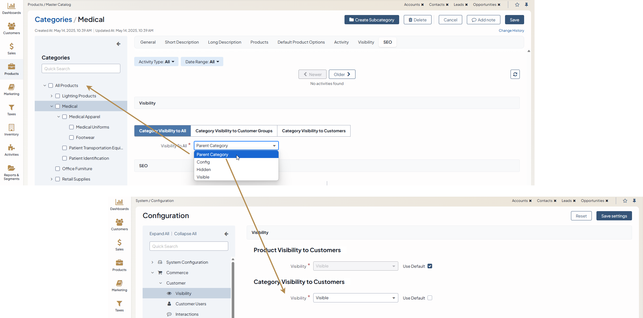 Parent Category Visibility: Inherits settings from the parent category unless specifically overridden by a subcategory or product visibility.