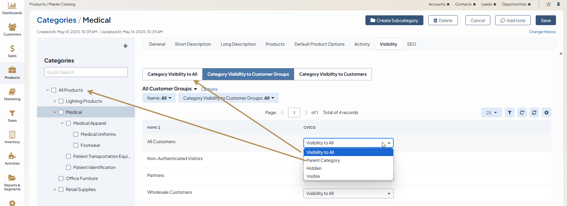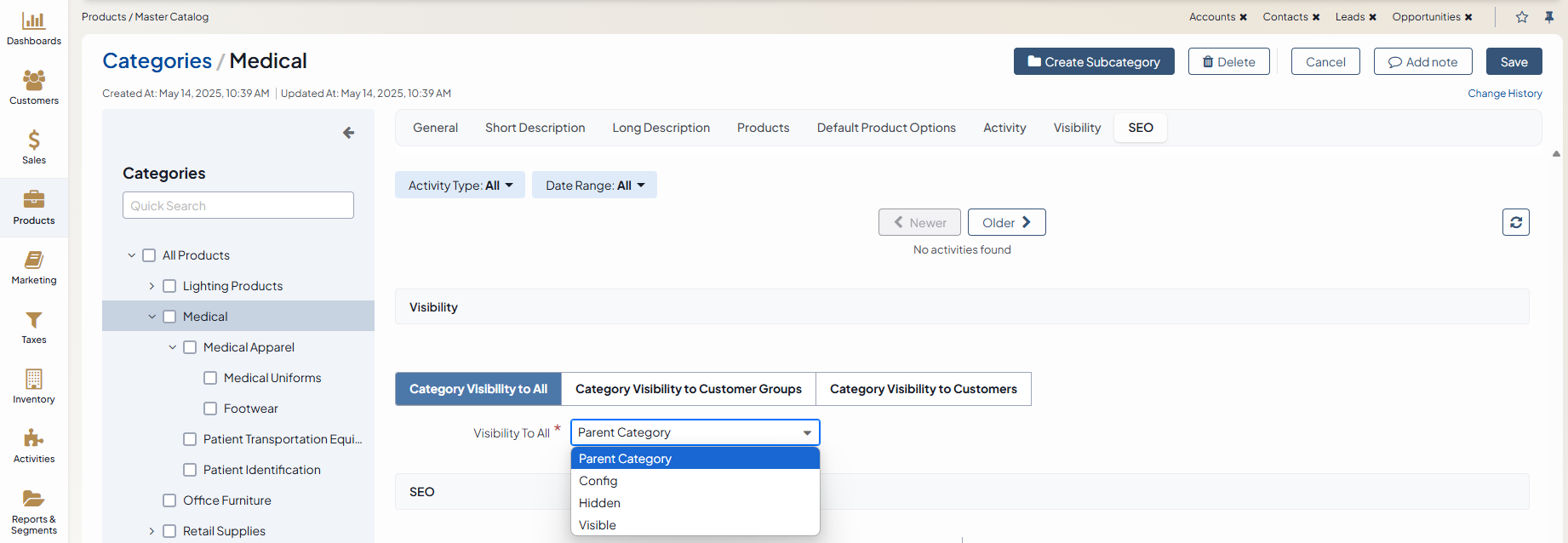 Category Visibility to All: Controls the visibility of the product’s category and overrides the parent category visibility.