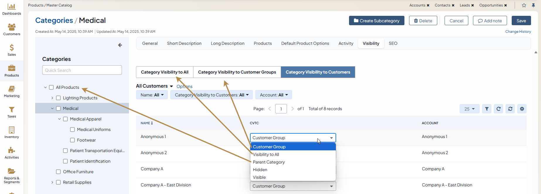 As a follow-up, see the Configure Product and Category Visibility to Customers topic for the details on how to control the default visibility settings for master catalog categories and subcategories through the back-office.