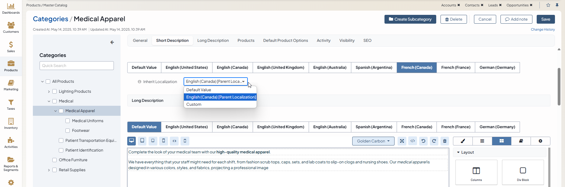 In the Long Description section, provide a long default description of the category. Move from tab to tab to localize the description by setting the required fallback option. You can select whether to fall back to the default value, parent localization, or a custom value from the dropdown. When selecting the custom value, provide the localized version of the long description in the WYSIWYG field. For more details on WYSIWYG management, see the WYSIWYG Editor topic.