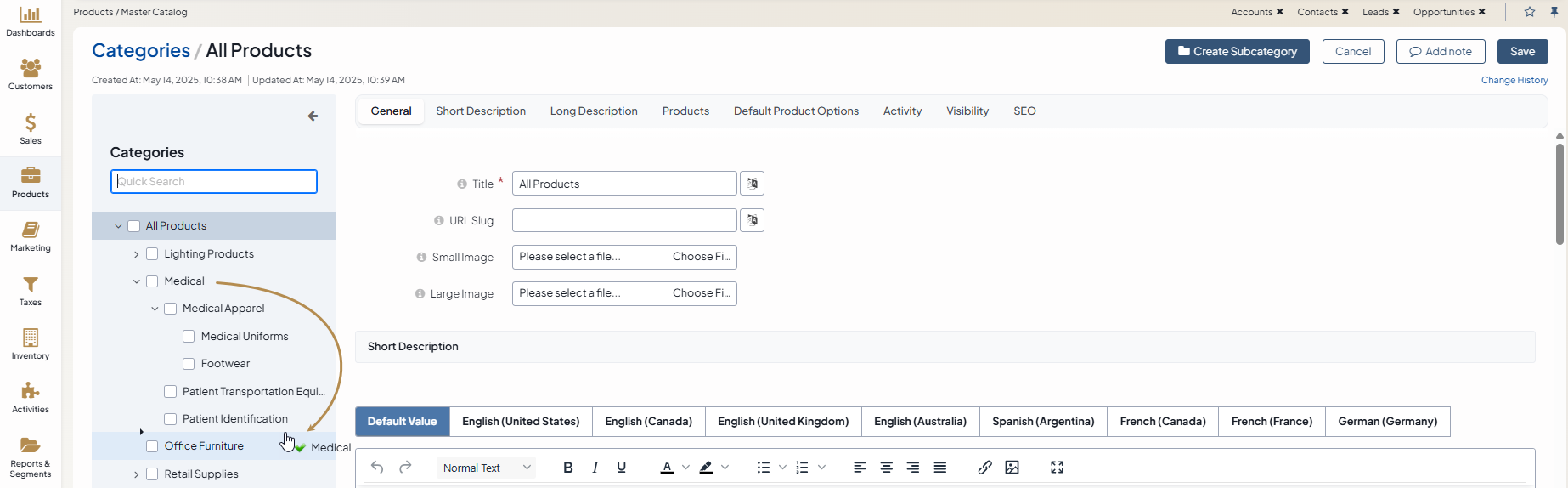 By default, there is only one master catalog in the OroCommerce application. To customize this catalog, you can add or delete a category, creating a group of products and linking it to the corresponding web catalog.