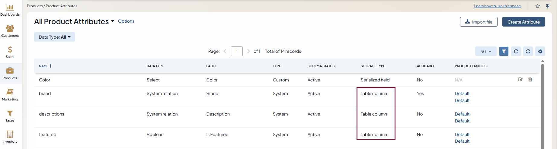 The product attribute storage type is set to table column for the attribute with Select of Multi-Select data type, and also for the attribute of any type with Filterable or Sortable option enabled. If this step is omitted, the newly created attribute will not appear in the select attribute options in other areas of OroCommerce (e.g., product families configuration).