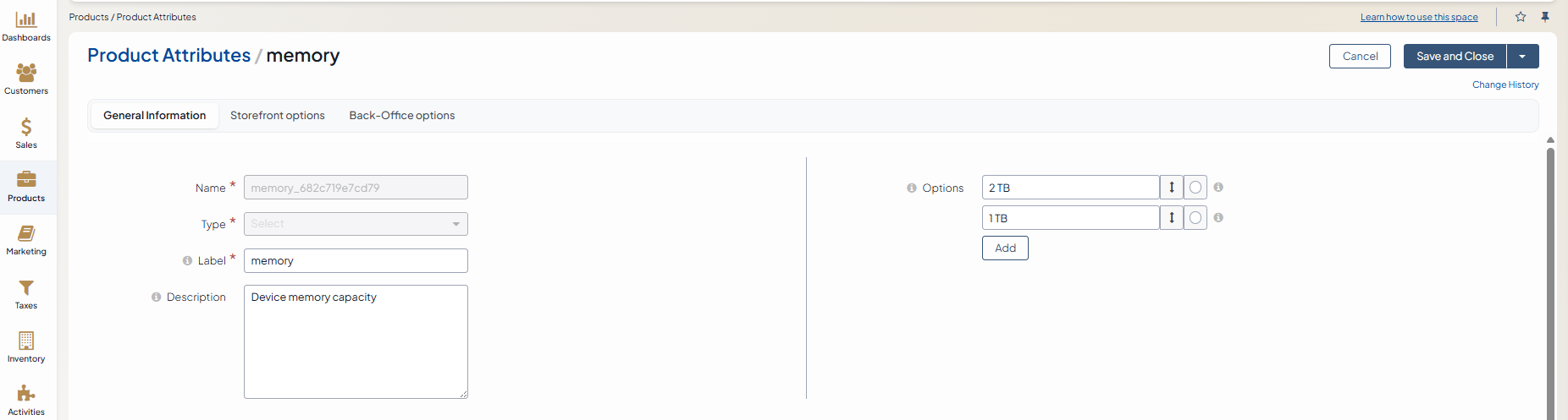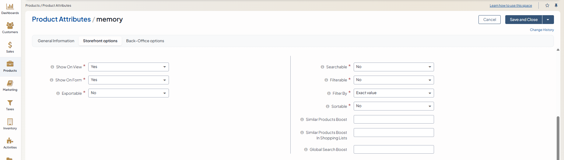 In the Storefront options section, set up the storefront options applicable to the product attribute.